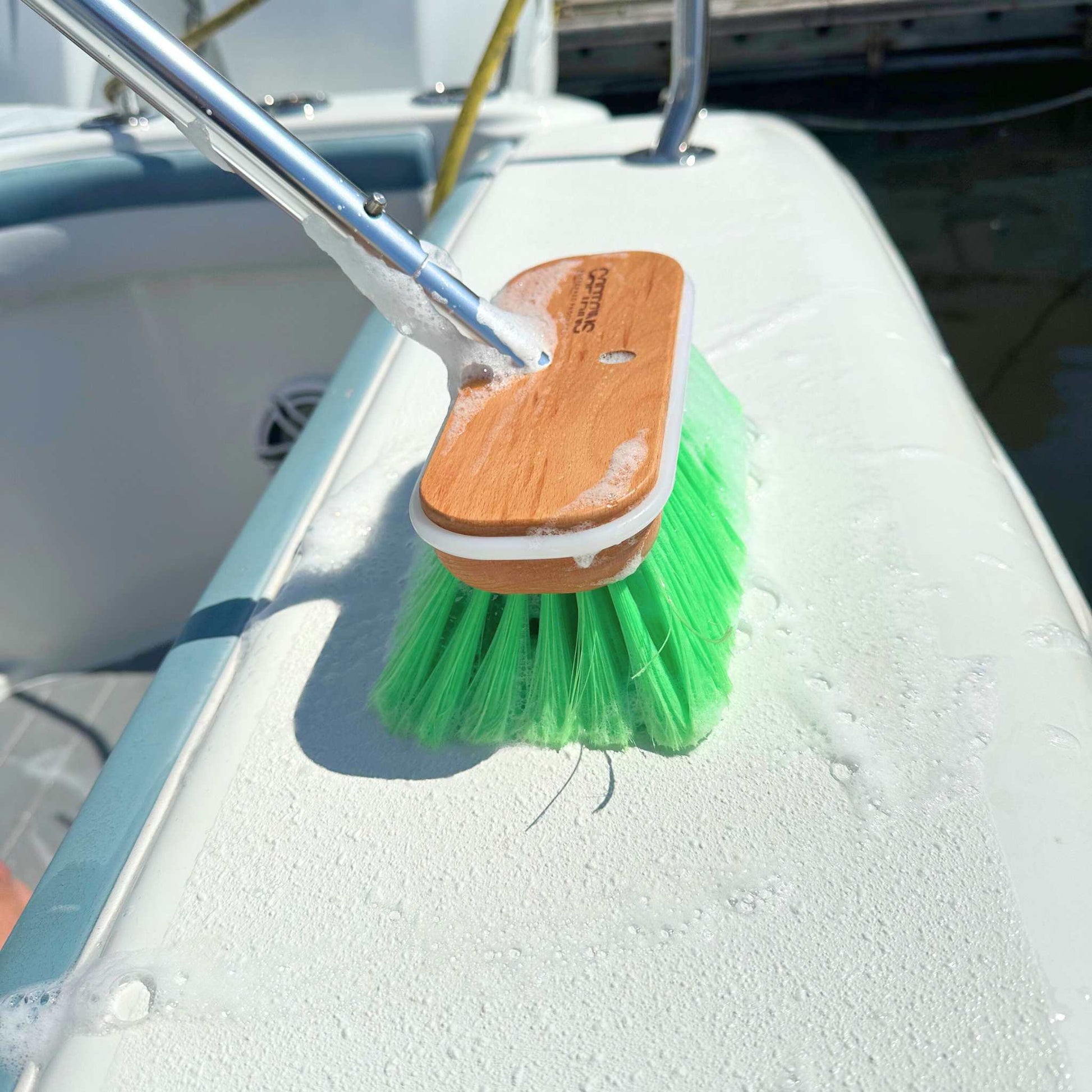 Solid wood brush head with polystyrene bristles–made to handle all boat surfaces and handle tough marine environments
