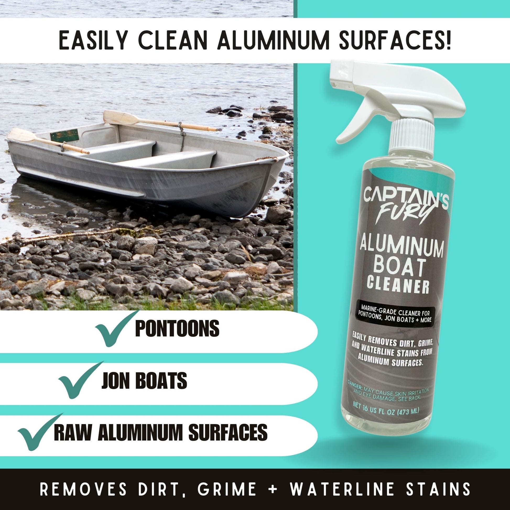 Our powerful, marine-grade formula works by creating a chemical reaction with raw aluminum to cut through dirt, grime, and waterline stains. For painted aluminum surfaces, we recommend Captain's Fury Heavy-Duty Hull Cleaner.
